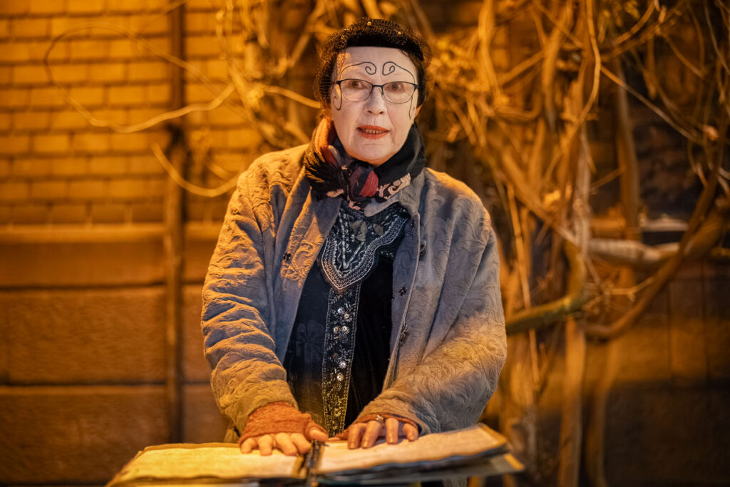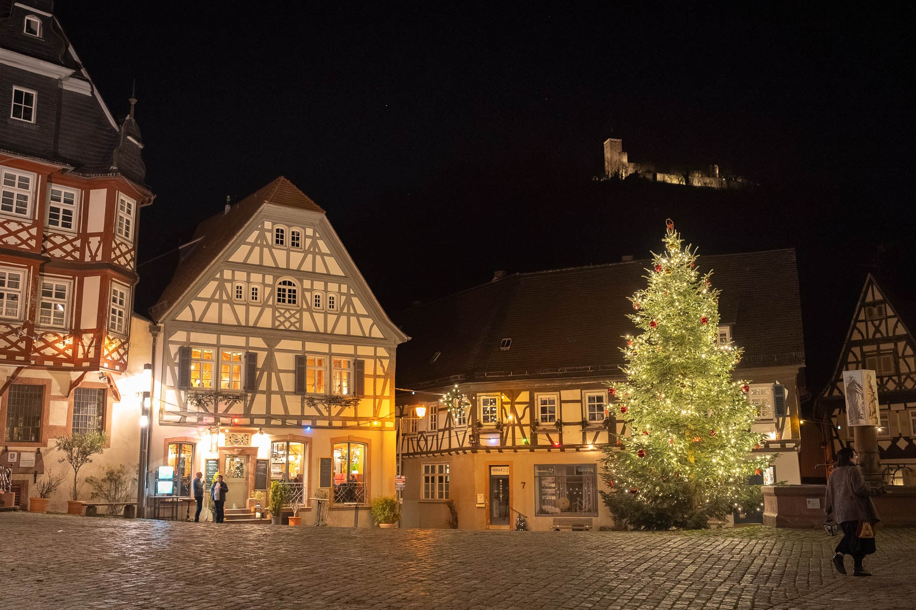 Die Gassen der Heppenheimer Altstadt sind fast menschenleer an diesem Winterabend. Nur hier und da sind dumpfe Schritte oder leises Stimmengemurmel zu hören. Fast ein wenig unheimlich – wäre da nicht der Weihnachtsbaum auf dem Marktplatz, der mit tausenden Lichtern gegen die Dunkelheit anleuchtet. Etwas abseits des Platzes scheint eine Laterne in die Schunkengasse, die hier vom Marktplatz abzweigt. Darunter steht eine Gestalt auf einer Leiter. Weißes Gesicht, schwarzer Hut, langes Kleid, die Hände ruhen auf einem großen Buch.
